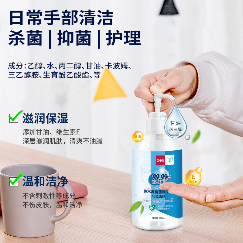 商品名称:得力31001免水洗抗菌洗手液(透明)(240ml/瓶)